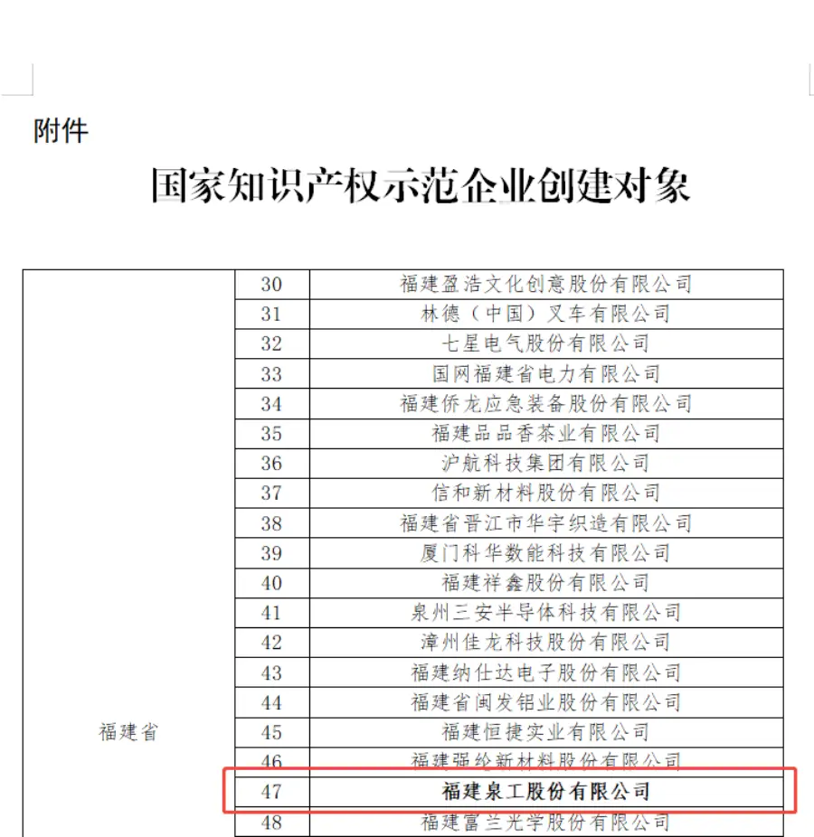 Erkännande på nationell nivå: Quangong Machinery Co., Ltd. har valts ut som kandidat för National Intellectual Property Demonstration Enterprise-programmet.