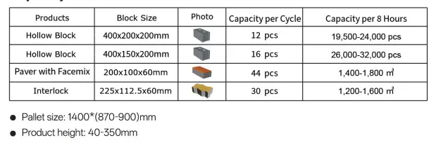 Utrustningen producerar ett brett utbud av ihåliga tegelprodukter, som täcker flera funktionella typer såsom vanliga block, dekorativa block och isoleringsblock. Hålformer inkluderar fyrkantiga och runda hål, och arrangemanget kan uppnå enkelrads-, dubbelrads- och flerradshålstrukturer. Genom att ändra formen eller justera utrustningsparametrarna kan olika typer av tegelprodukter växlas flexibelt för att möta olika marknadskrav.